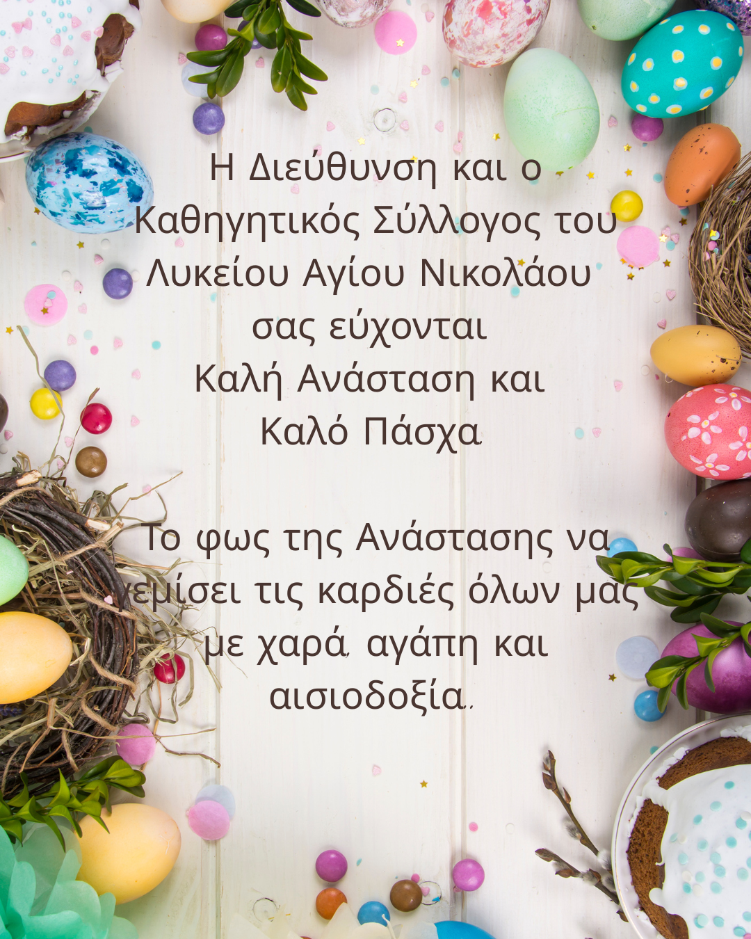 Σας καλωσορίζουμε στη νέα ιστοσελίδα του Λυκείου Αγίου Νικολάου και σας ευχόμαστε καλή περιήγηση. Μέσα από την ιστοσελίδα μας σας καλούμε να γνωρίσετε τη ζωή του Σχολείου μας και να ενημερώνεστε για τις δραστηριότητες και τα επιτεύγματα των παιδιών μας.Κοινός στόχος όλων μας είναι η διαμόρφωση ενός εκπαιδευτικού περιβάλλοντος, όπου η δημιουργία, η ποιότητα, η συνεργασία και ο σεβασμός αποτελούν για όλους εμάς, εκπαιδευτικούς και μαθητές, βασική προτεραιότητα. Μέριμνα μας η ουσιαστική σχέση Σχολείου - οικογένειας και μέσα σε αυτό το πλαίσιο αισιοδοξούμε να λειτουργήσει η ιστοσελίδα μας, ως ένας ασφαλής και αξιόπιστος τρόπο ενημέρωσης και επικοινωνίας σε θέματα που αφορούν τη λειτουργία και οργάνωση του σχολείου καθώς και του εκπαιδευτικού έργου γενικότερα. Καλή πλοήγηση λοιπόν!!!