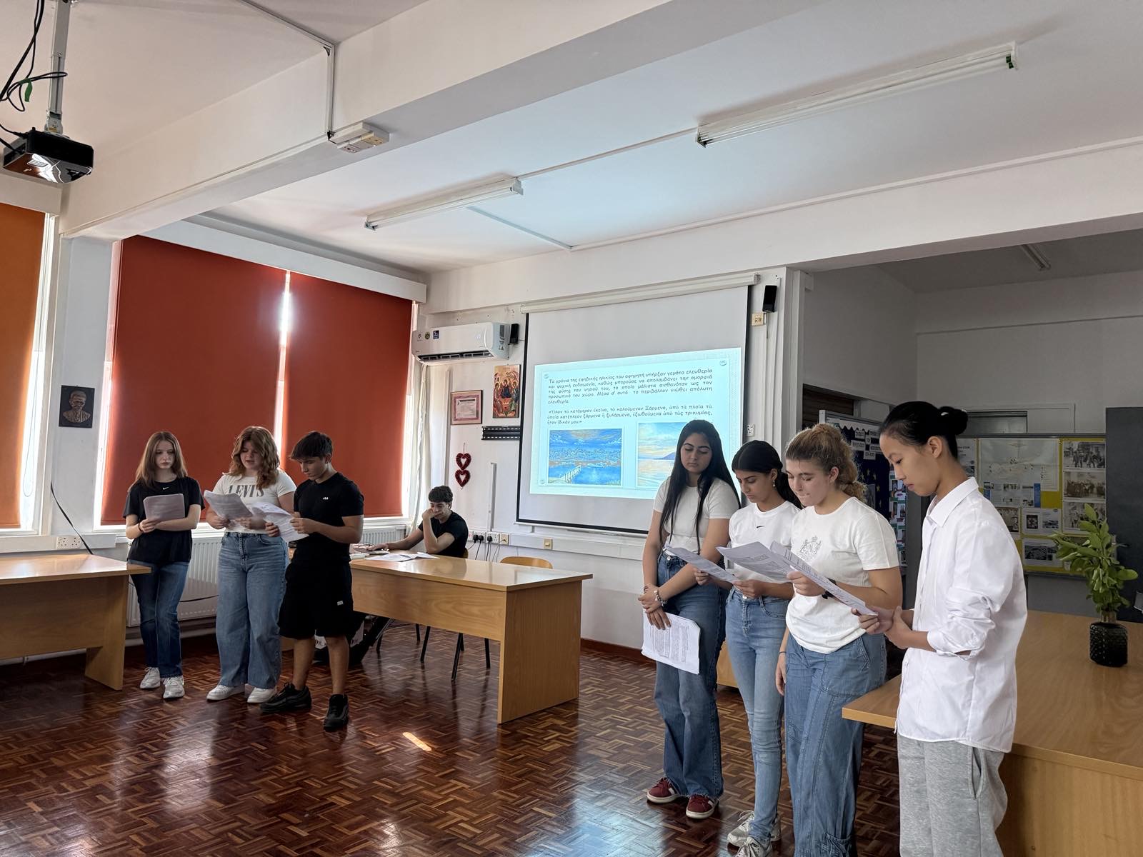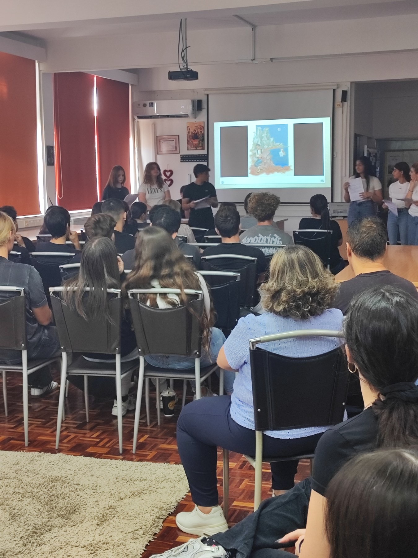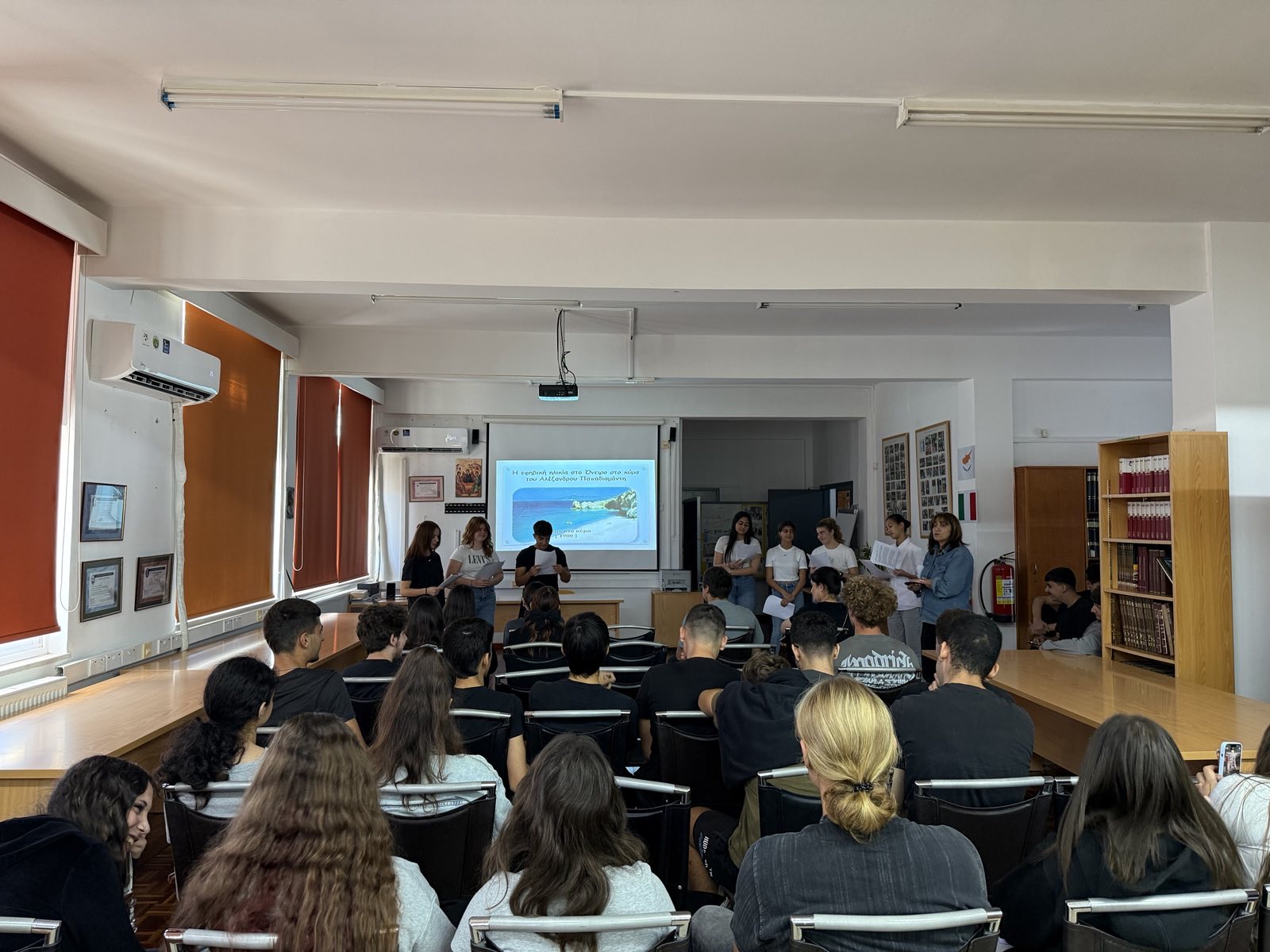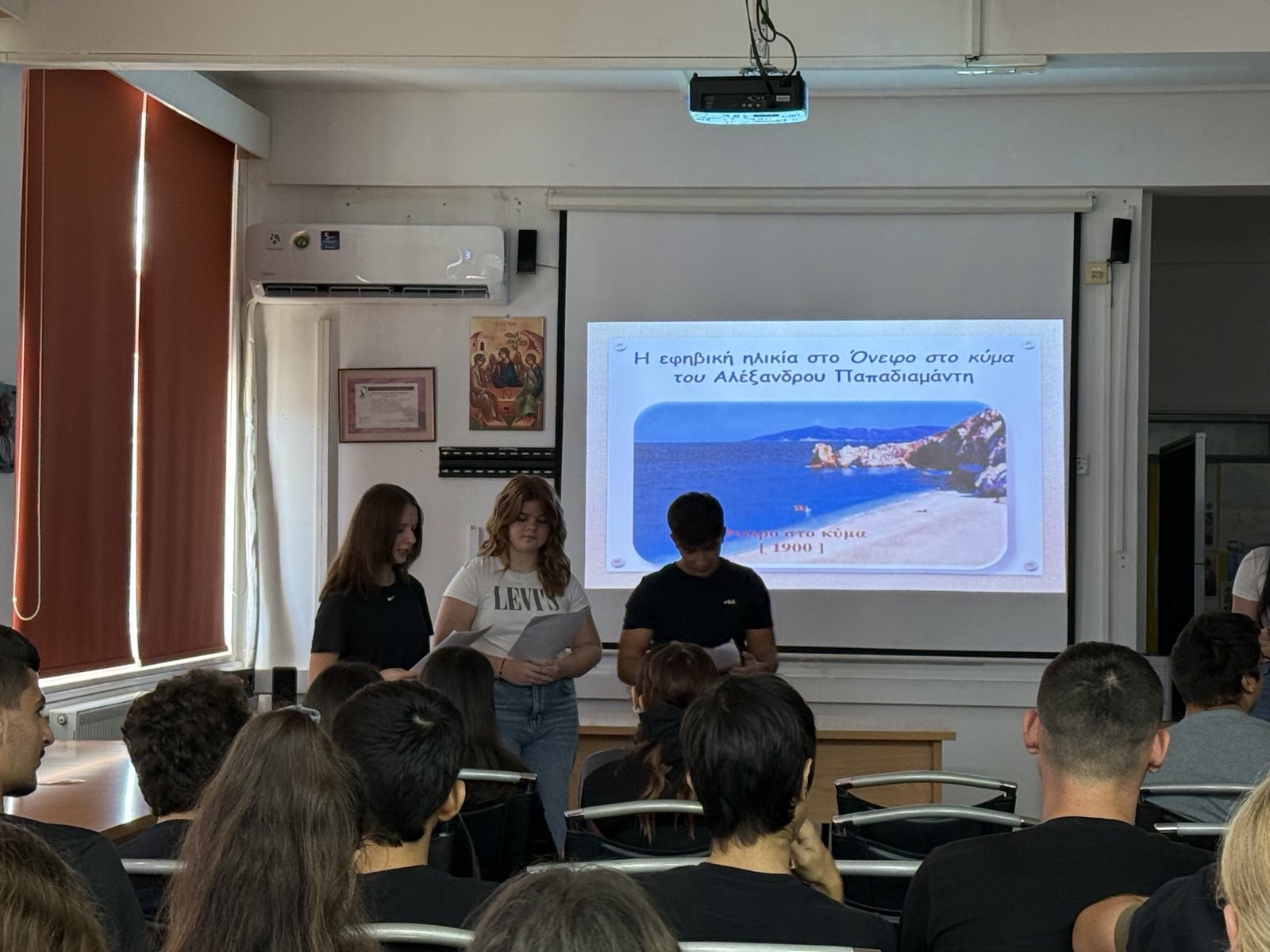 Στα πλαίσια του στόχου που έθεσε το Σχολείο μας κατά τη σχολική χρονιά 2025-2026: Βελτίωση των μαθησιακών αποτελεσμάτων, οι μαθητές του Β31 παρουσίασαν στις 31 Οκτωβρίου 2025 το δεύτερο διάλειμμα στη σχολική βιβλιοθήκη την εργασία με θέμα: Η εφηβική ηλικία στο διήγημα Όνειρο στο κύμα του Α. Παπαδιαμάντη. Η παρουσίαση ήταν διανθισμένη με οπτικοακουστικό υλικό και τονίστηκε ότι το συγκεκριμένο διήγημα του Παπαδιαμάντη στηρίζεται πάνω σε μια βασική αντίθεση του «τότε» με το «τώρα». Το «τότε» συνδέεται με την εφηβεία, την ευτυχία, τη φύση, το όνειρο, ενώ το «τώρα» με την ωριμότητα, τη δυστυχία. Επίσης αναφέρεται στο ερωτικό ξύπνημα των εφήβων. Ο έρωτας στο διήγημα αυτό έχει τη μορφή απραγματοποίητου ονείρου στo κύμα, ενός έρωτα ανολοκλήρωτου.